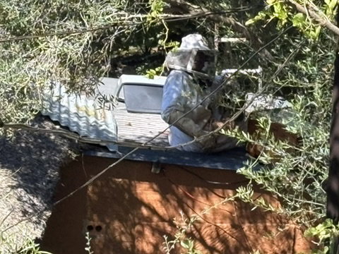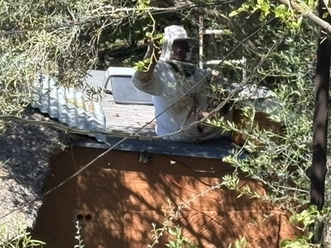 Below, ground control (a couple of curious onlookers and probably someone holding their breath) watched as the operation unfolded. The hive was carefully opened, the bees gently persuaded that relocation was in their best interest, and then — the jackpot.